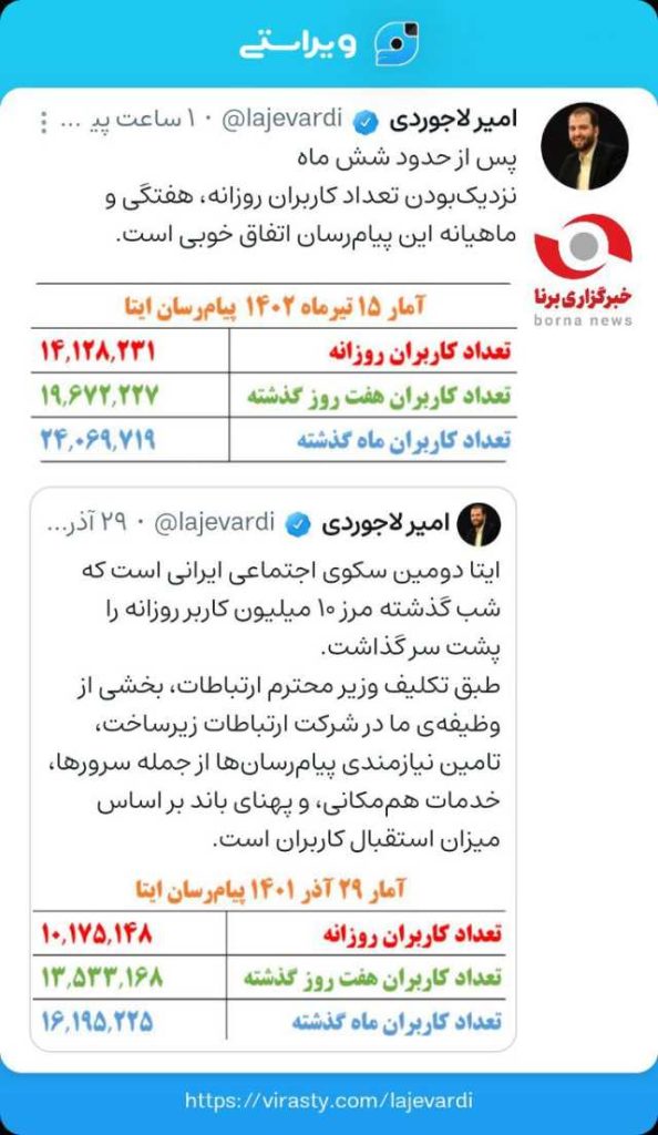 امیر لاجوردی، قائم مقام وزیر فاوا در امور ارتباطات در ویراستی خود اعلام کرد که ایتا ماه گذشته ۲۴ میلیون کاربر فعال داشته است و در هفت روز گذشته نیز آمار حکایت از فعالیت قریب به ۲۰ میلیون کاربر در ایتا دارد.